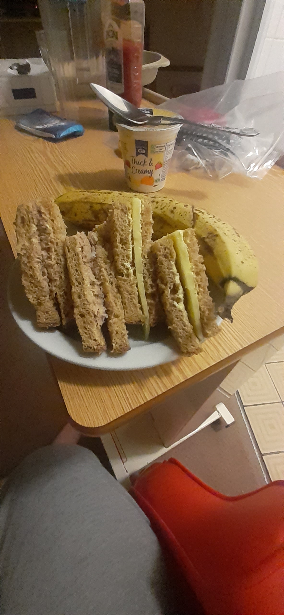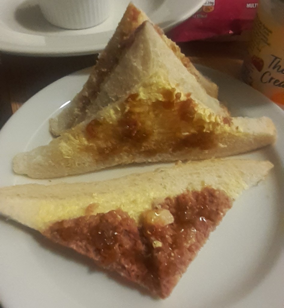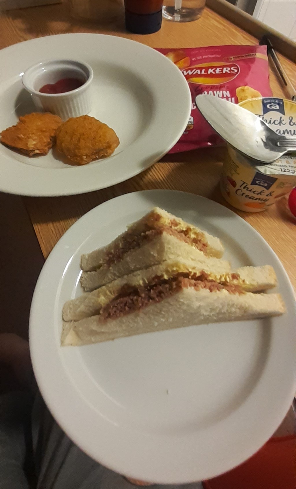 Before that was supper, and I was very glad the lunchtime jacket potato was quite generous as the offering was… a bit pathetic, tbh. Two lukewarm chicken nuggets (clearly the cheapest of the cheap variety), two underfilled triangles of corned beef and (allegedly) pickle sandwich, a packet of crisps, and a yoghurt isn’t much of a supper, even if I was rather pleased to eat a yoghurt that wasn’t strawberry or toffee flavour for a change! (Apricot and mango – very nice, if not quite Muller Thick and Creamy nice.)