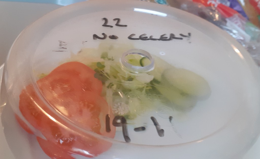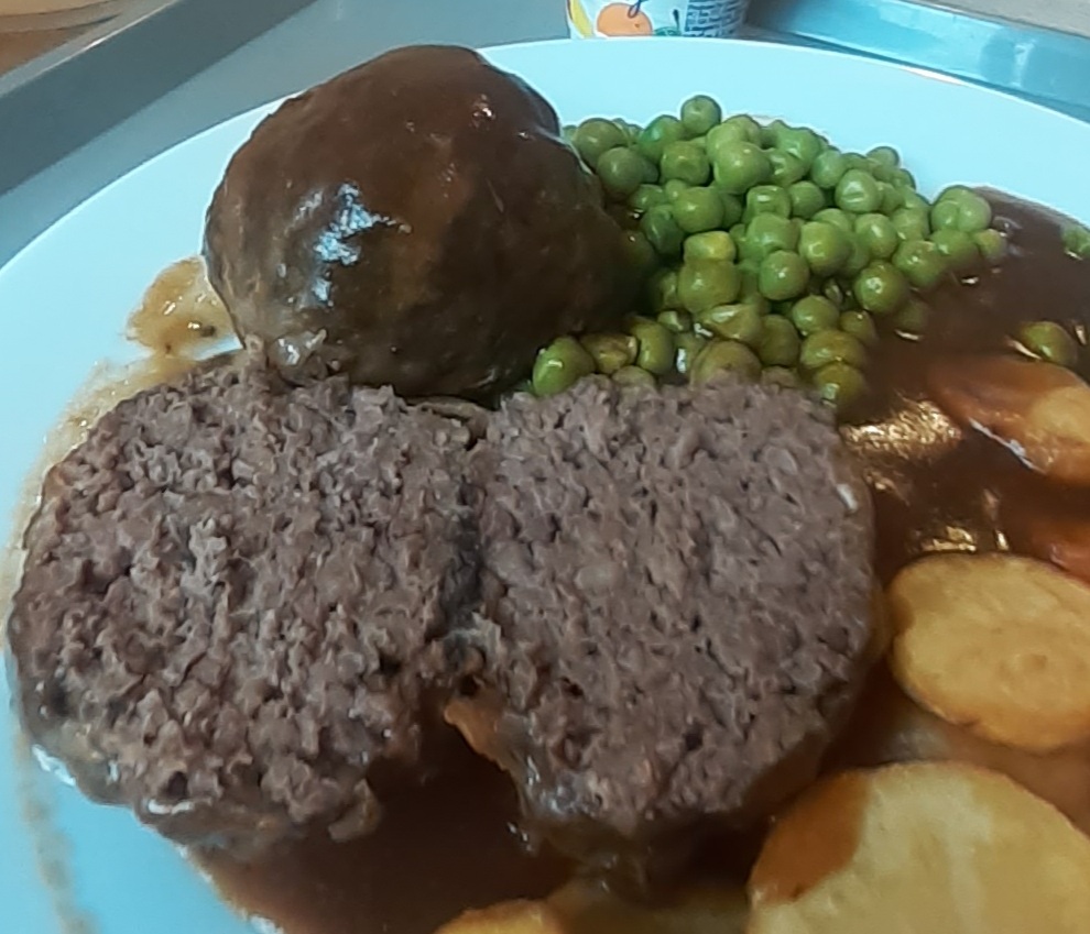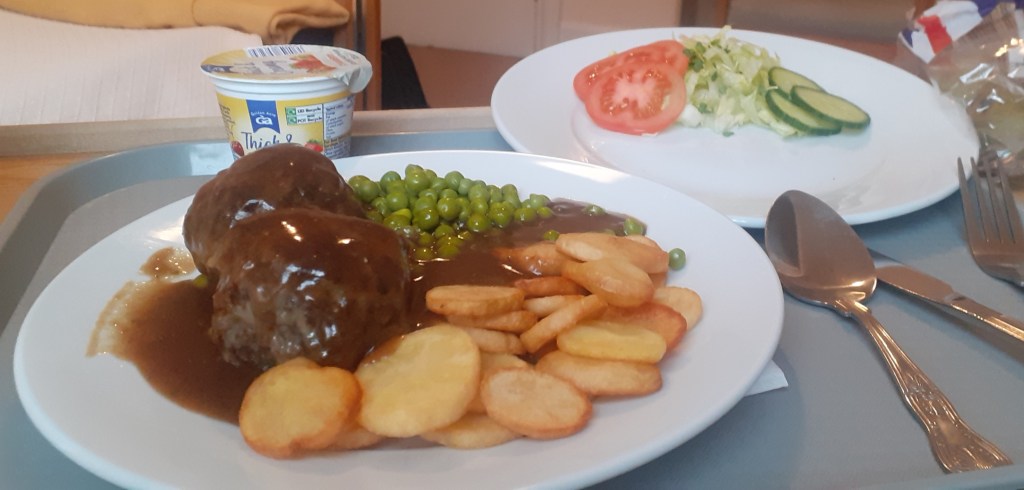 I didn’t think salad would go with my main course so ate it as a starter, quickly so my main course didn’t go cold, meaning that when the nurse brought me my lunchtime meds all I could manage through a mouthful of lettuce and tomato was “mmph? Mmph mm mmph! Mmph! “👍 I’m not sure whether to be pleased or worried that, on the basis of three days’ acquaintance, she seemed to get my meaning.