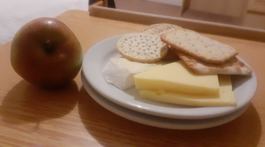 Cheese and biscuits: a good selection of biccies, two pieces of nice medium-to-mature cheddar, and a bit of brie that had welded itself to the plate and had to be scraped off with the soup spoon, showing it was properly ripe. Being a fussy foodie I would have preferred a third type of cheese and/or a bit of chutney, but still: 9/10