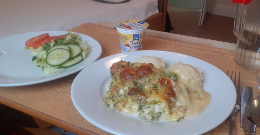 Or not, because I didn’t fancy the pudding today (white chocolate and raspberry roulade: things I like separately but not together, for some reason) so asked for fruit and yoghurt (yet more dairy) instead.