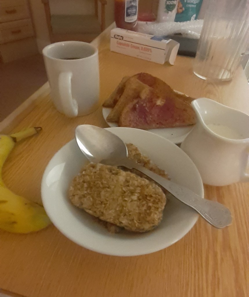 Meanwhile, of course, food has been happening. Breakfast was my usual spread of Weetabix with hot (well, vaguely lukewarm, today) milk, wholemeal toast with butter and (just about) jam, and a banana.