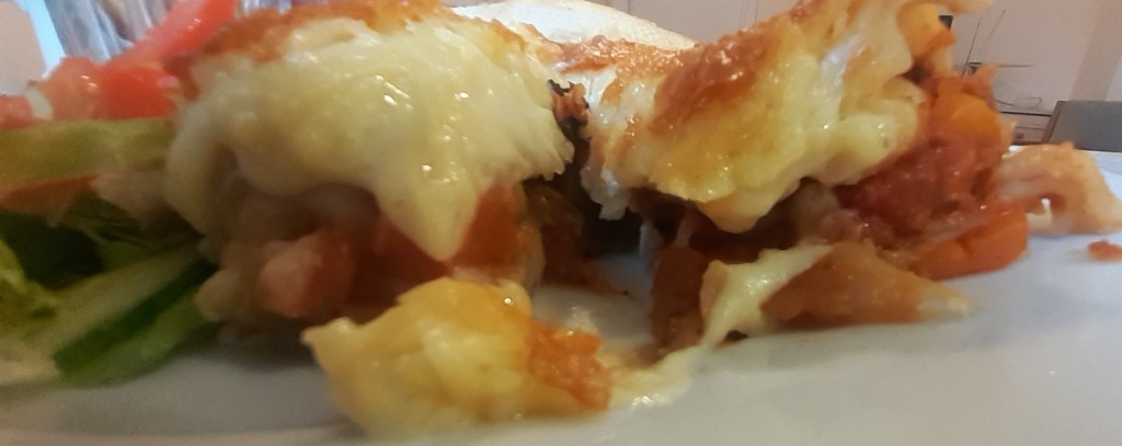It was, I think, a mixture of veg left over from other meals and frozen mixed veg: if I’m right, I will say that I am 100% in favour of reducing food waste by turning leftovers into something tasty. And I’m very pleased to note that that was one thing this lasagne definitely did not have in common with its St Mary’s counterpart – this one was perfectly edible, even good. The thick layer of cheese sauce and golden melted cheese on top helped considerably, I must say, but how can that ever be a bad thing?