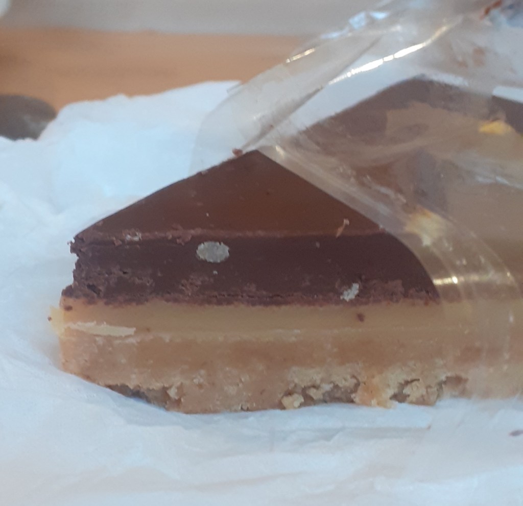 I airily told the nice H2, who delivered my lunch, that I didn’t want pudding as I had plenty of fruit. Which was true, and I did eat one of my apples (crunchy, tasty, juicy: Aldi do do good apples, I’m discovering), and it was just unfortunate timing that he returned as I was doing the somewhat overdue review of The Millionaire Baker’s Old Jamaica (rum and raisin) millionaire’s shortbread. By which I of course mean I had a mouthful of chocolate and caramel when he came to collect the dirty plate from my lunch. 😳