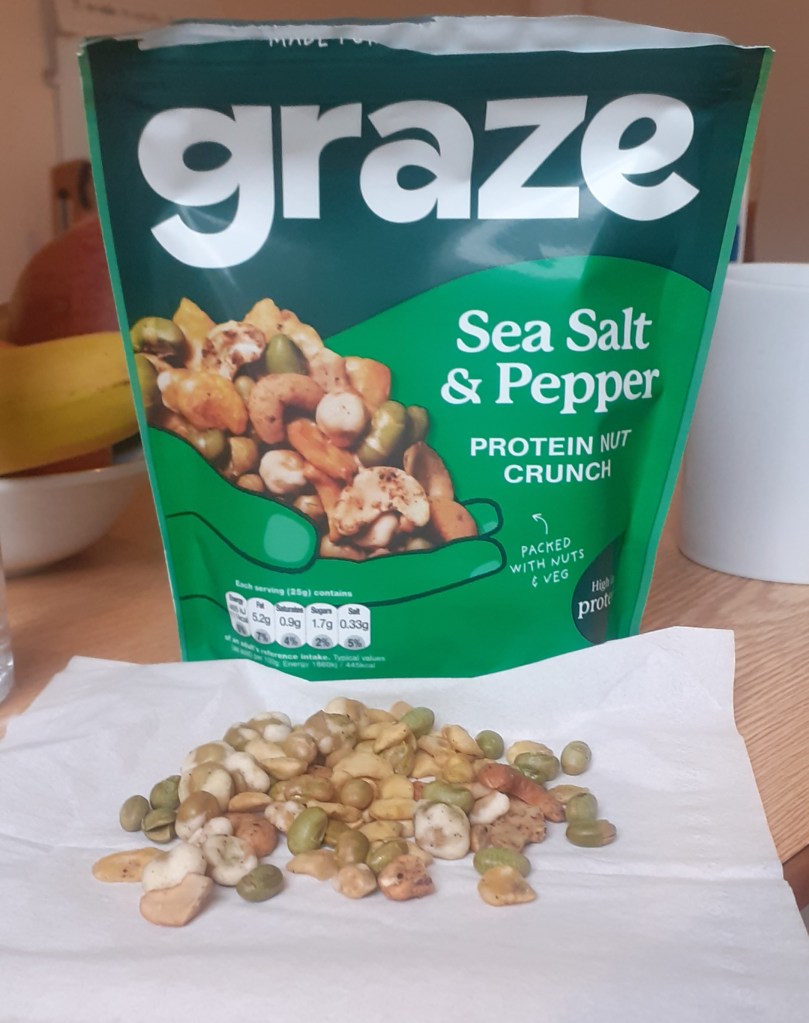The reason I turned down the offer I scrambled eggs, which I would never usually do as I’m very fond of a scrambled egg, was that I had the remains of a bag of Graze’s Salt and Pepper Protein Nut Crunch sitting, looking expectantly at me, just begging to be crunched through, and who am I to refuse?
