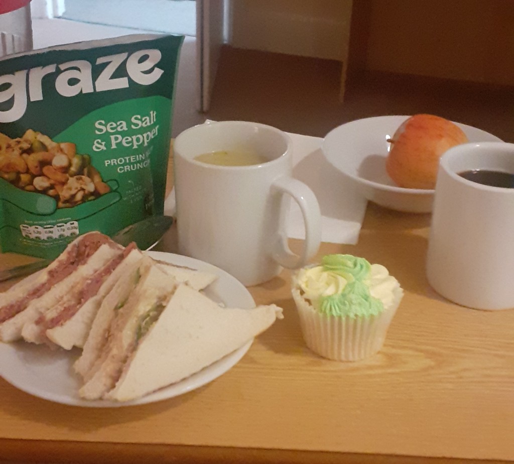 Anyway… supper, served tonight by someone I will refer to by the initial O1, who was very keen to make sure I had enough to eat, even going so far as to offer to make me some scrambled eggs if I so wished. Thank you – genuinely, no sarcasm – for your consideration and willingness to go above and beyond for your residents, and I am so sorry my stupid brain refuses to hold on to people’s names.