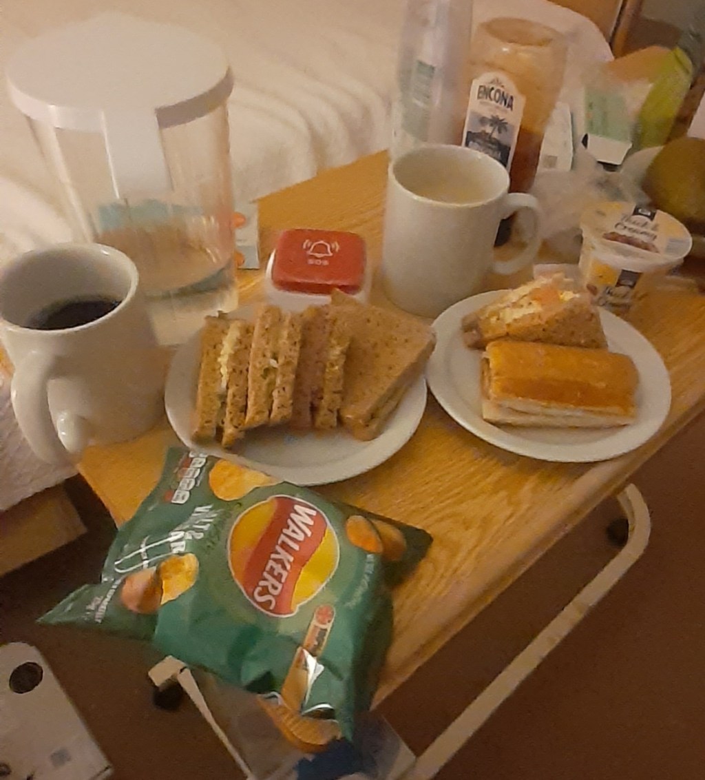 Soup; sausage roll; sandwiches; crisps; yoghurt; the last millionaire’s shortbread (sob)