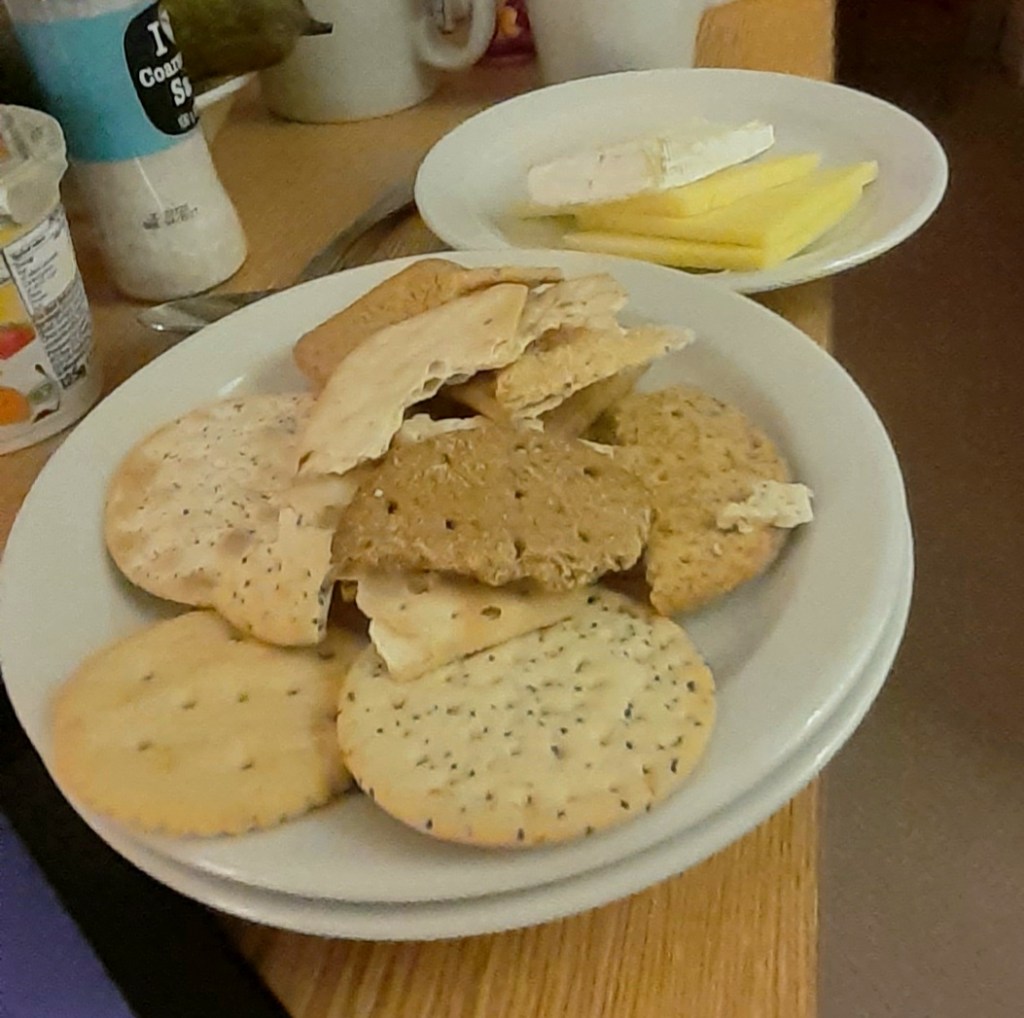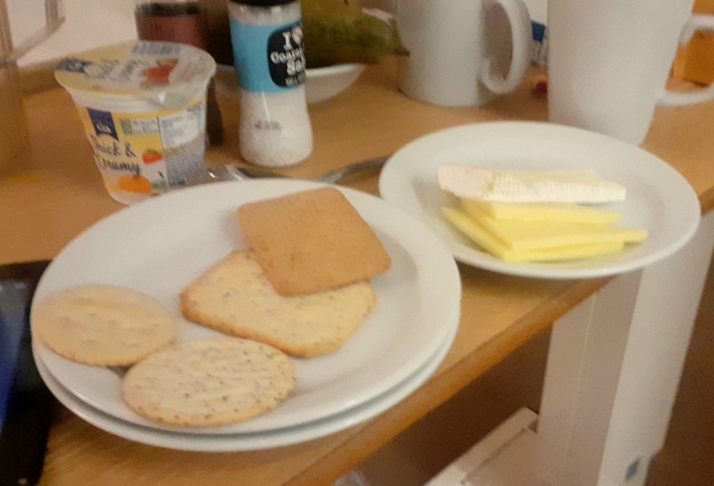 Then cheese and biscuits, for the all important protein (and even more all important ‘being cheese’ factor): four crackers tonight, including a Ritz one (or knock-off version of a Ritz that tastes identical) and one of the ones they call ‘wheatmeal’ but are just digestive biscuits by any other name.