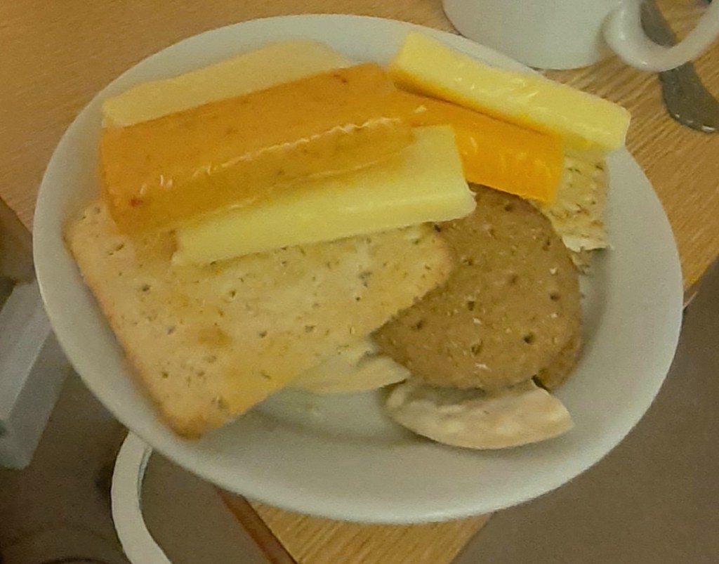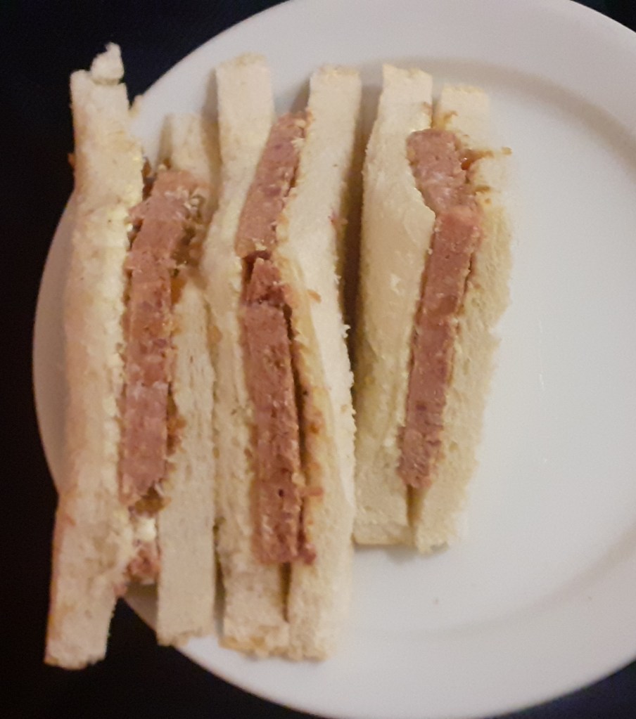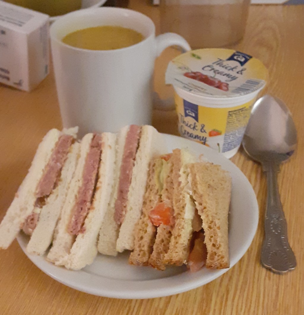 Tonight’s supper was much like every other one I’ve had here, but I have noticed one big improvement since my first evening here, and that’s in the quantity of filling in the sandwiches.