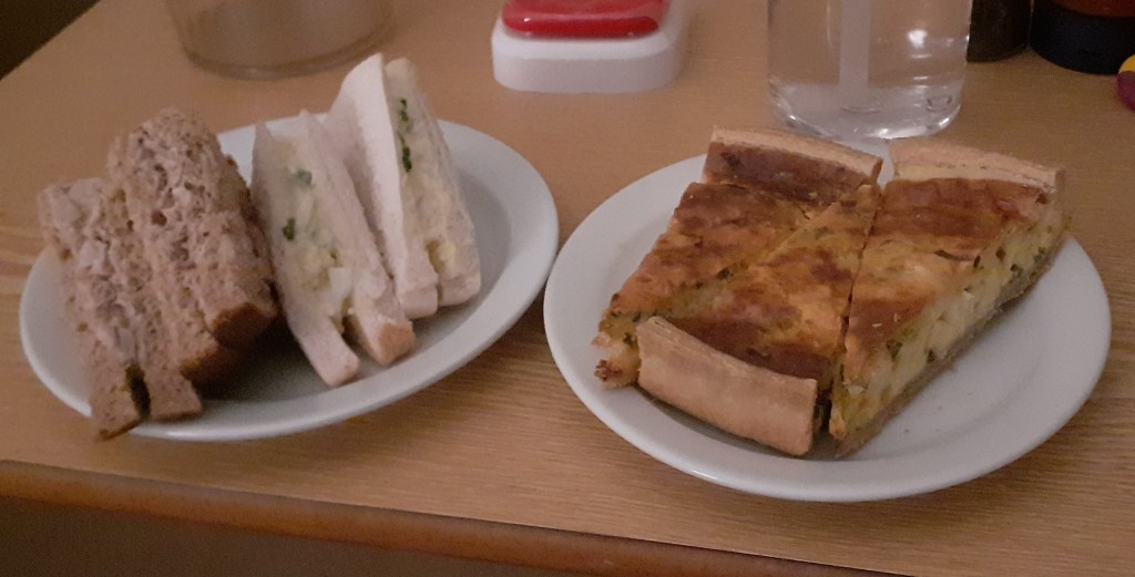 The supper special tonight was Spanish quiche. One of the HCAs on trolley duty started telling me what made it Spanish, as relayed to him by the chef who made it, but the conversation got interrupted and never restarted, so I guess I’ll never know. It didn’t taste particularly Spanish, or anything else, but it was good quiche: crunchy shortcrust pastry, no soggy bottom, and a well-seasoned filling. The fact one of my room neighbours didn’t want any and I could therefore have three small pieces, together adding up to a piece of quiche worth eating, really helped.