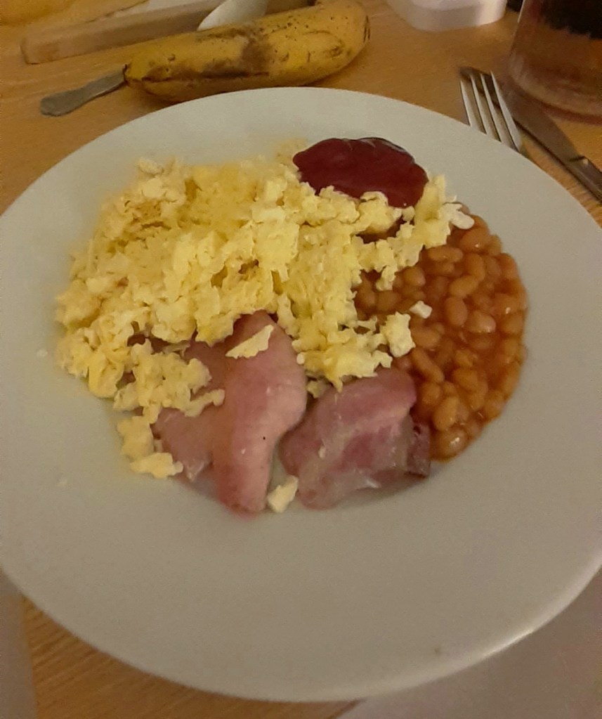 Breakfast: scrambled eggs, bacon, baked beans, toast and peanut butter; lunch: roast dinner – gammon