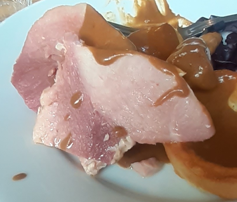 The gammon was a nice bit of cured pig – not too salty, decently tender – but gammon has a fairly subtle flavour which was almost entirely smothered by the gravy1. The red cabbage didn’t taste of anything much but sweet, and the parsnip (just one piece again – I really must remember to ask for extra) was also sweet, as was the gravy, so it was all a bit one-note. The roast potatoes were fine, as was the Yorkie (Aunt Bessie’s finest, or the catering suppliers’ own version of – again, no judgement, my chef BIL swears by them).