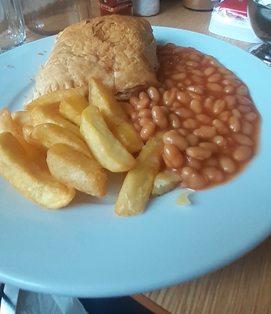 I don’t know if the pasty was homemade – I think it probably was – but the filling was definitely better than the Greggs version, fine though that is: this was incredibly cheesy in a way that might have been too much if eaten alone but was just right with beans and ketchup. (Told you I was eating like a child!) If it wasn’t homemade, it was an extremely good bought-in pasty.