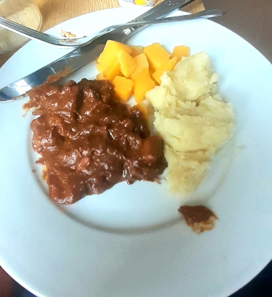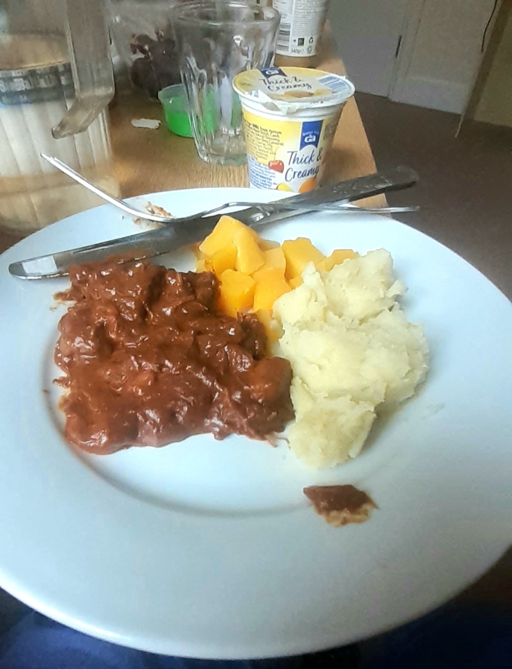 (Anyone new to this and thinking “that’s not a bad portion for lunch”, please bear in mind that this is my main meal of the day – the evening meal is a mug of soup and three quarters of sandwich (maybe a couple of extra sandwiches if I ask nicely and the other residents aren’t also feeling hungry) – and I’m doing a lot of physio to rebuild muscle from practically nothing, which requires fuel from food.)