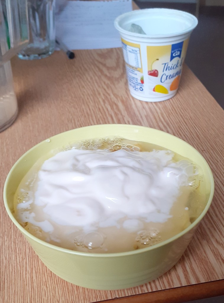 I said I had fruit, she countered with ice cream, and we compromised on yoghurt, which I poured on top of the contents of two pots of peaches in juice to make a sort of dessert / drink.