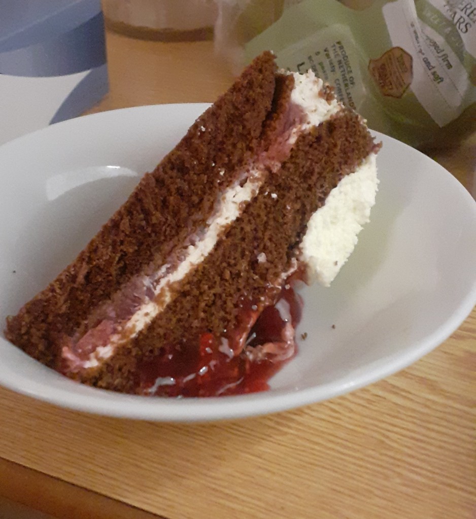I then had a pear, having finally discovered how to find out if they’re ripe (give your pear a gentle squeeze around the base of the stem: if it’s soft, it’s ripe. If it’s hard, it’s not. It really works, or at least it did on the one I had). And then a slice of Black Forest (chocolate and cherry) gateau, which is interesting because for pretty much all of my life I have hated chocolate – really, genuinely loathed the stuff, to the point of (apparently) turning green in the face at the mere scent of it.