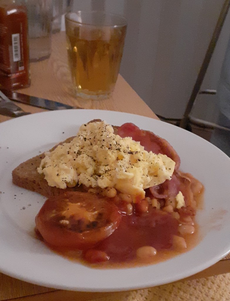Mostly to note that this time the scrambled eggs were appropriately yellow rather than grey, and they could be eaten without my fork bouncing off them. I added a load of black pepper to the eggs, and some of my fierce chilli sauce to the ketchup, because when I have a cold I want things that are HOT!