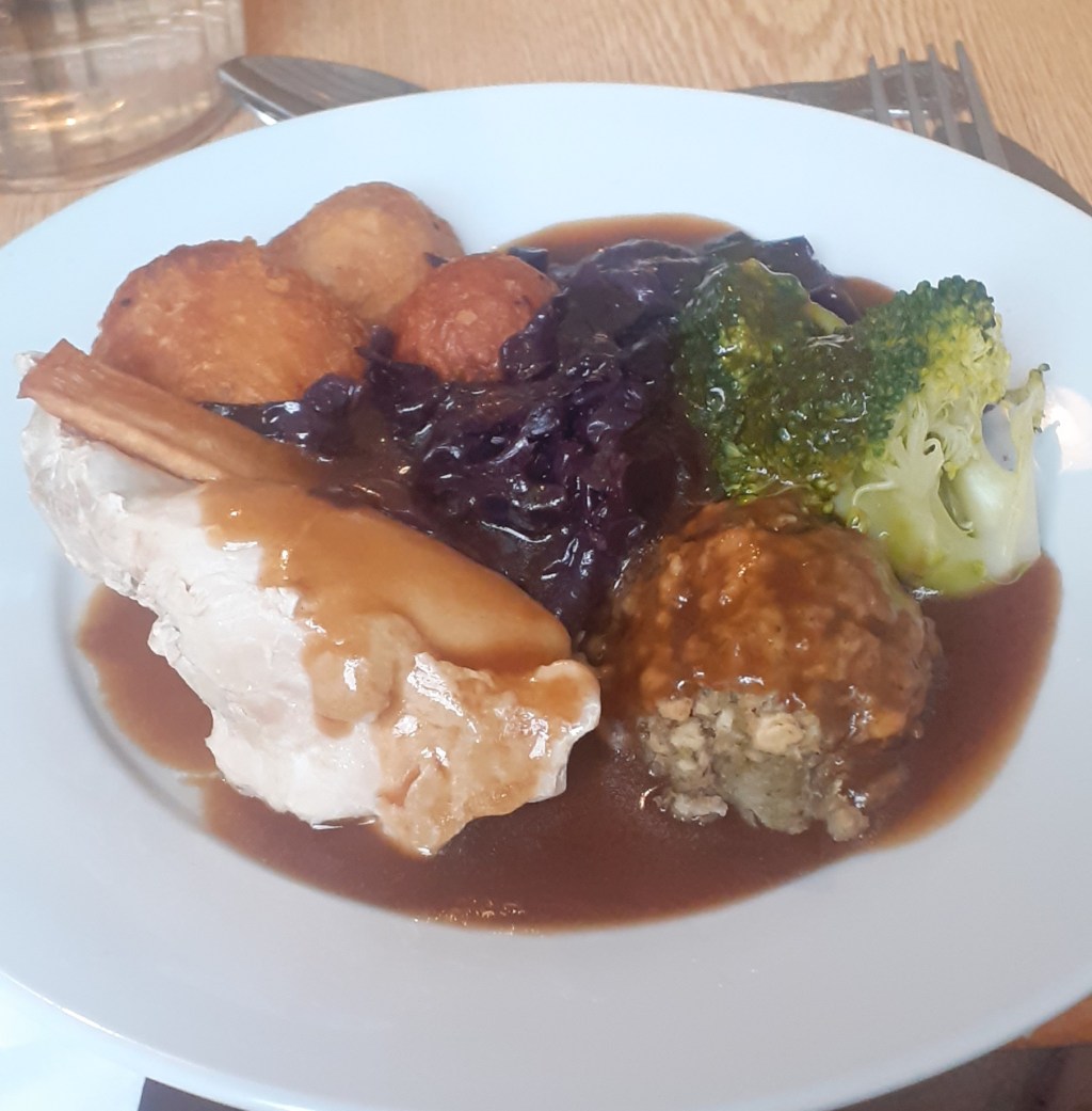 Red cabbage – better than last week in that it had some flavour to it other than plain boiled cabbage, and not just because I covered it in loads of black pepper. Broccoli – almost undercooked, with a definite snap to the stems, which is how I generally prefer my veg. Roast parsnip – yum, as always; I’m looking forward to getting home so I can have a whole parsnip, or even two, all to myself. Roasties – good. Gravy – ditto.