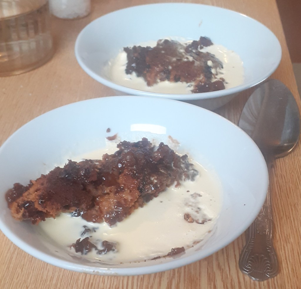 Dessert was sticky toffee pudding with cream (not custard as I said yesterday) and somehow there ended up being a spare portion “if you’d like it?” Of course I said yes, and was glad I did as this was a superior STP: lightly spiced, with a slightly bitter quality to the toffee that stopped it being too sweet, and perfectly complemented by the thick cream.