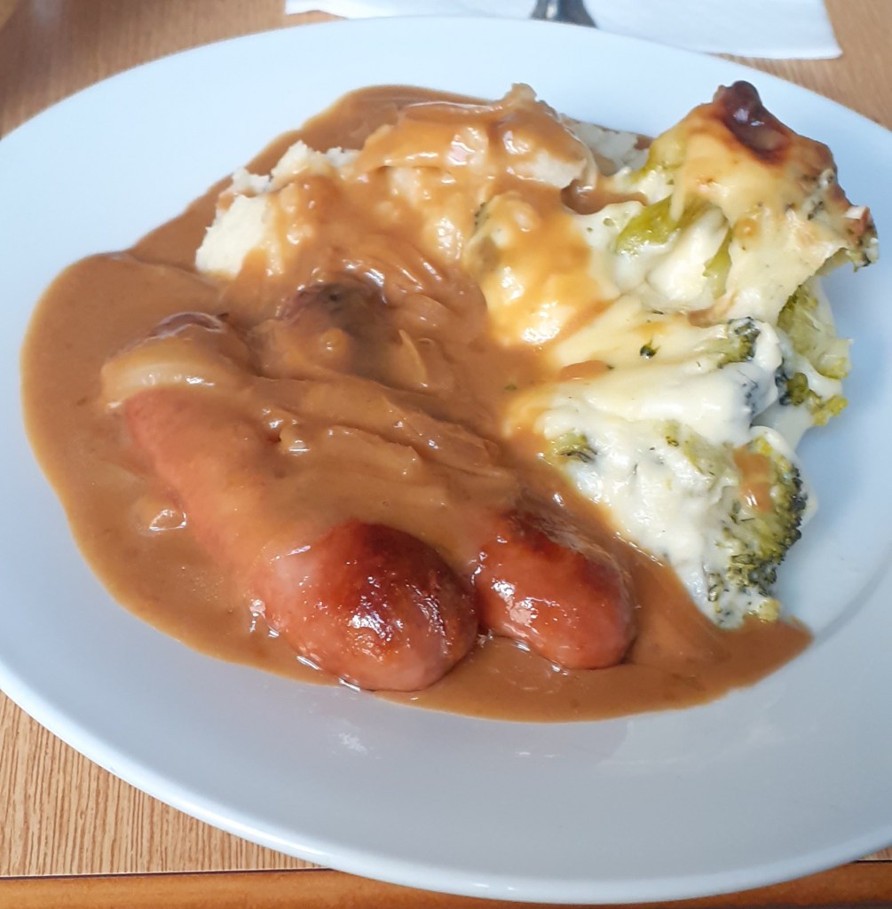 Sausages, mash and onion gravy with broccoli cheese; jam roly-poly and custard