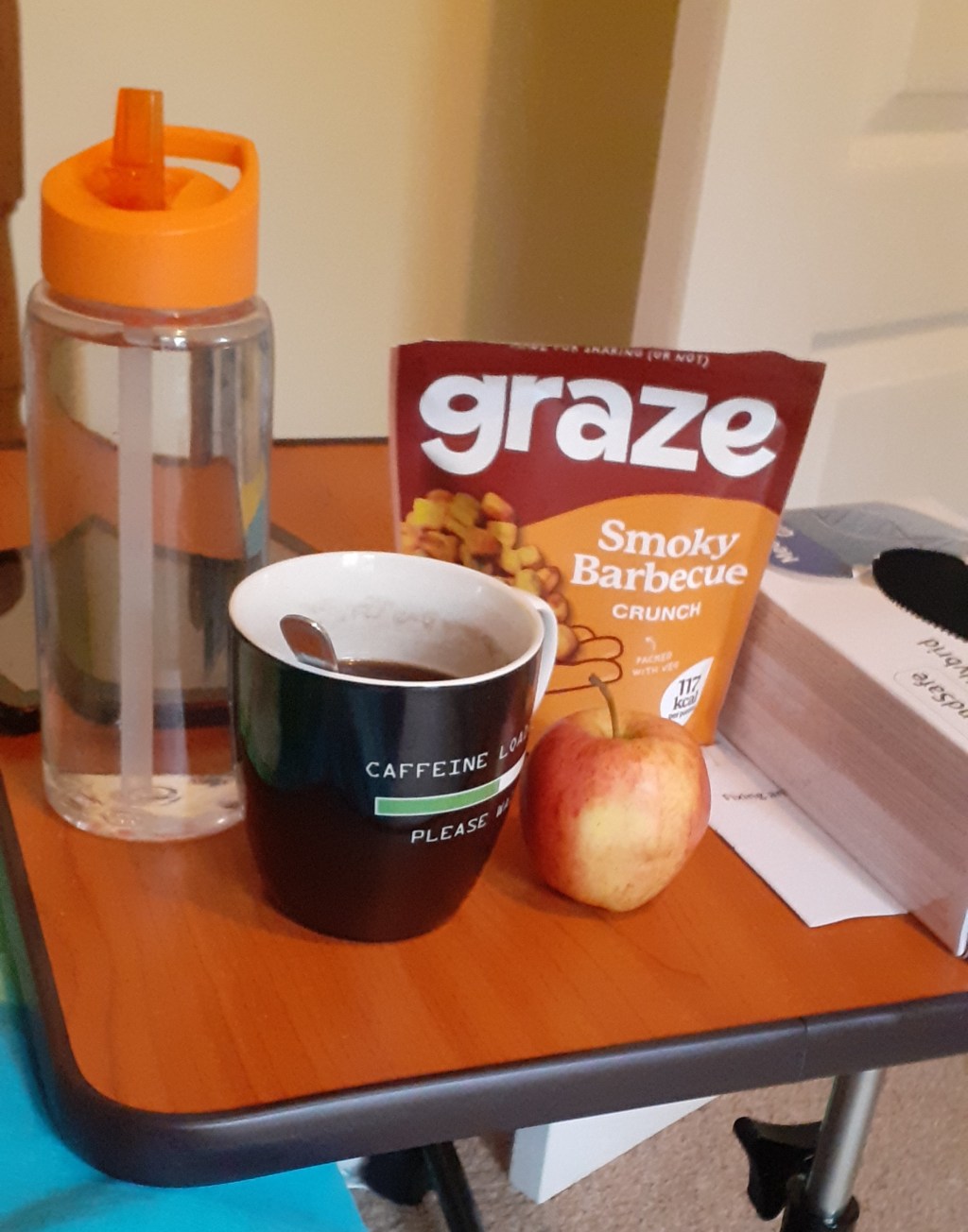 Just to let you all know, from now on my main meal of the day, and therefore the main review, will be in the evening. It is also somewhat lacking in photos, because I forgot to take one of my sandwich, although in the headline picture above you can see the little table I was given (well, allowed to borrow indefinitely – I can’t keep it forever) by the physio team: I briefly mentioned I would find it useful to take my care home table home with me, if it was lighter and more cooperative, and I was quite surprised when they produced exactly that from amongst the piles of stuff in the back of the car.