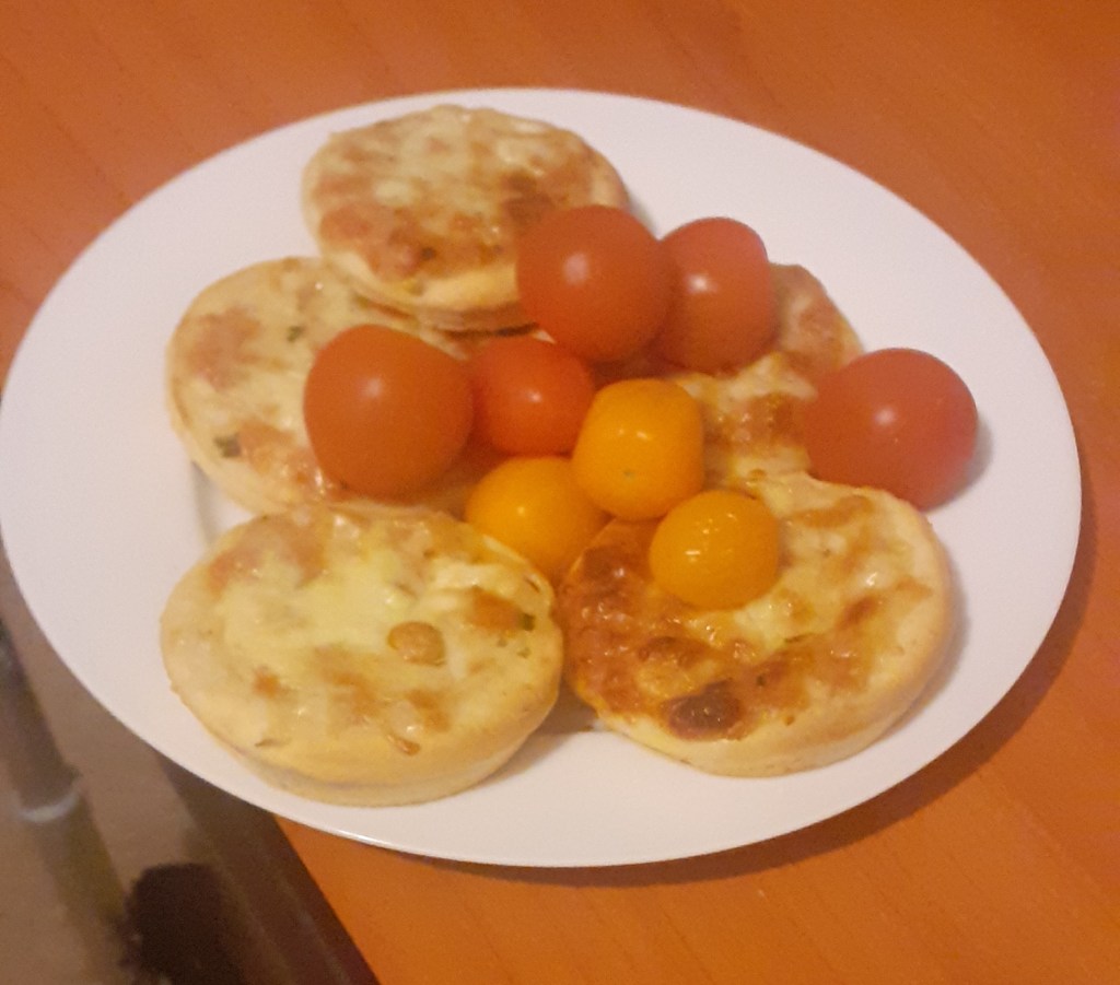 Mini cheese pizzas with cherry tomatoes; sticky toffee pudding and custard