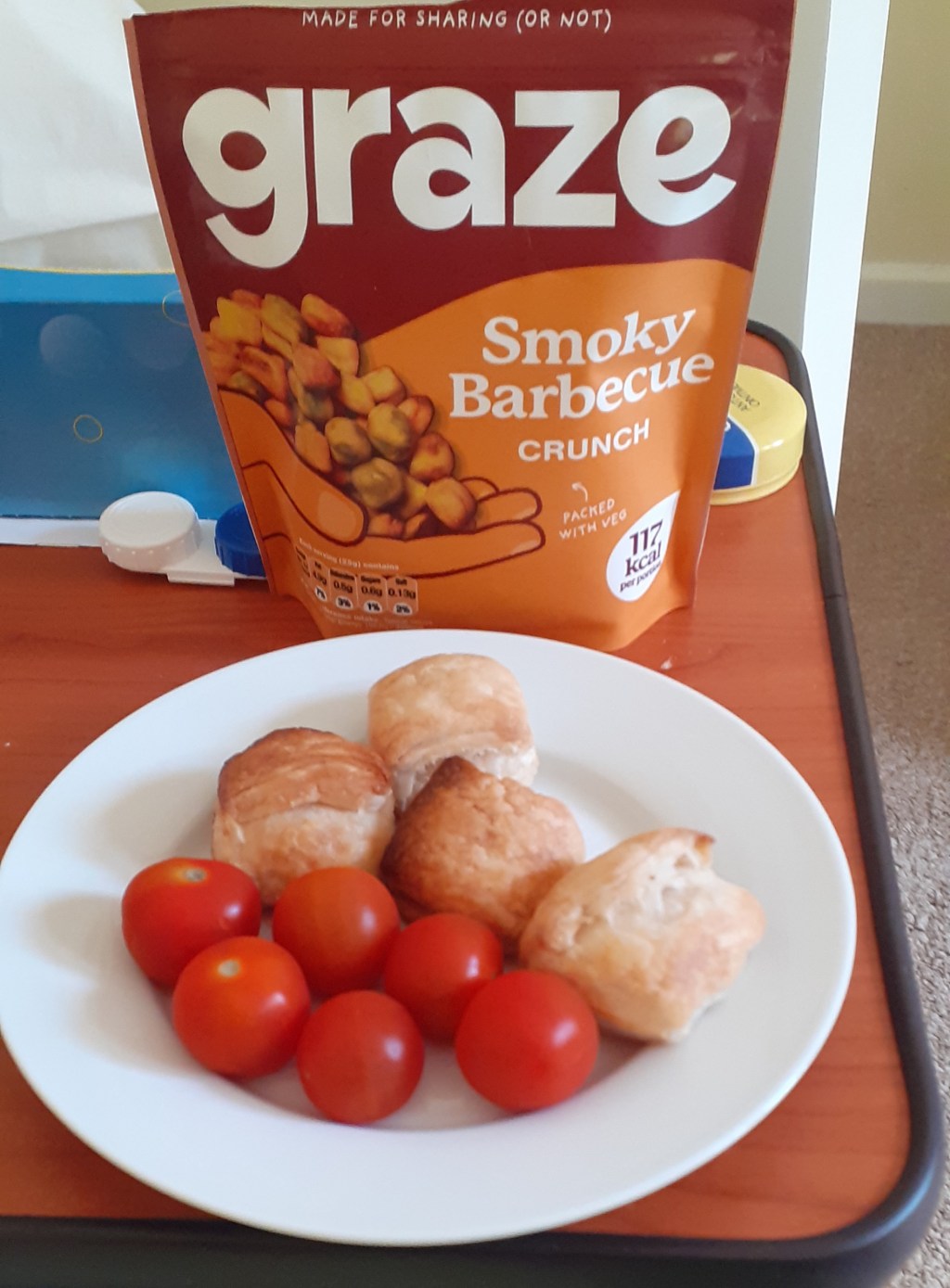So without the easy answer of ‘sandwiches’, what came to mind under carer E’s2 expectant gaze was “umm… cheese and onion rolls?” These are the frozen ones that are the vegetarian equivalent of cocktail sausage rolls, from Iceland as most things are atm, that you just put in the oven for 20 minutes or so to cook the pastry and heat the filling to around 1000°, although thankfully they cool down quickly.