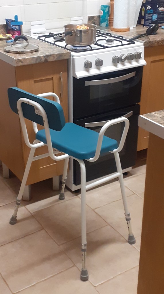If you’ve ever wondered where the magic happens, this is it. đ The perching stool is essential as I can’t stand for long (while being immensely grateful I can stand at all, of course), but has also been responsible, in the four days it has been here, for more trips, bruises, and stubbed toes than the rest of the furniture in the house put together.