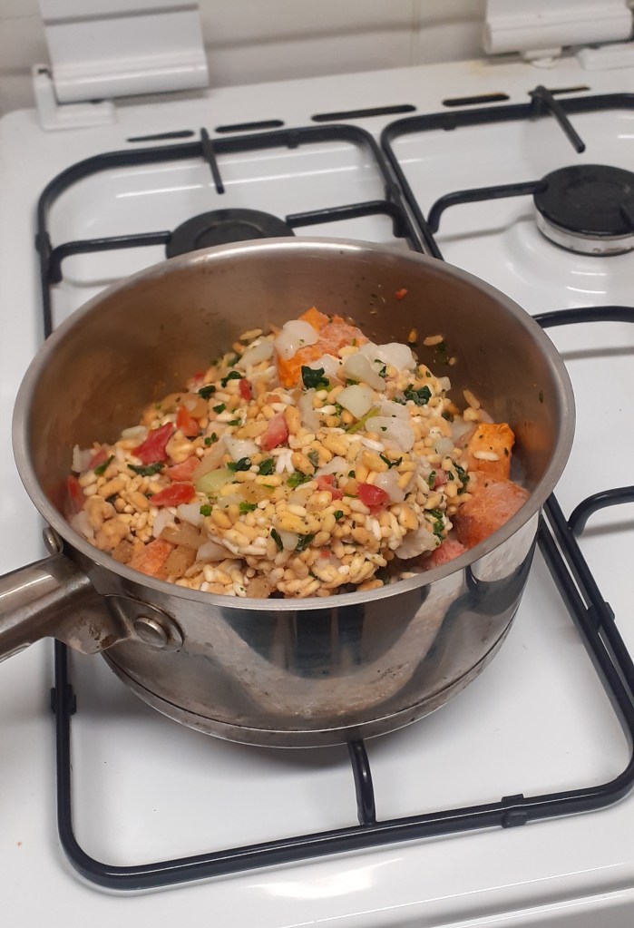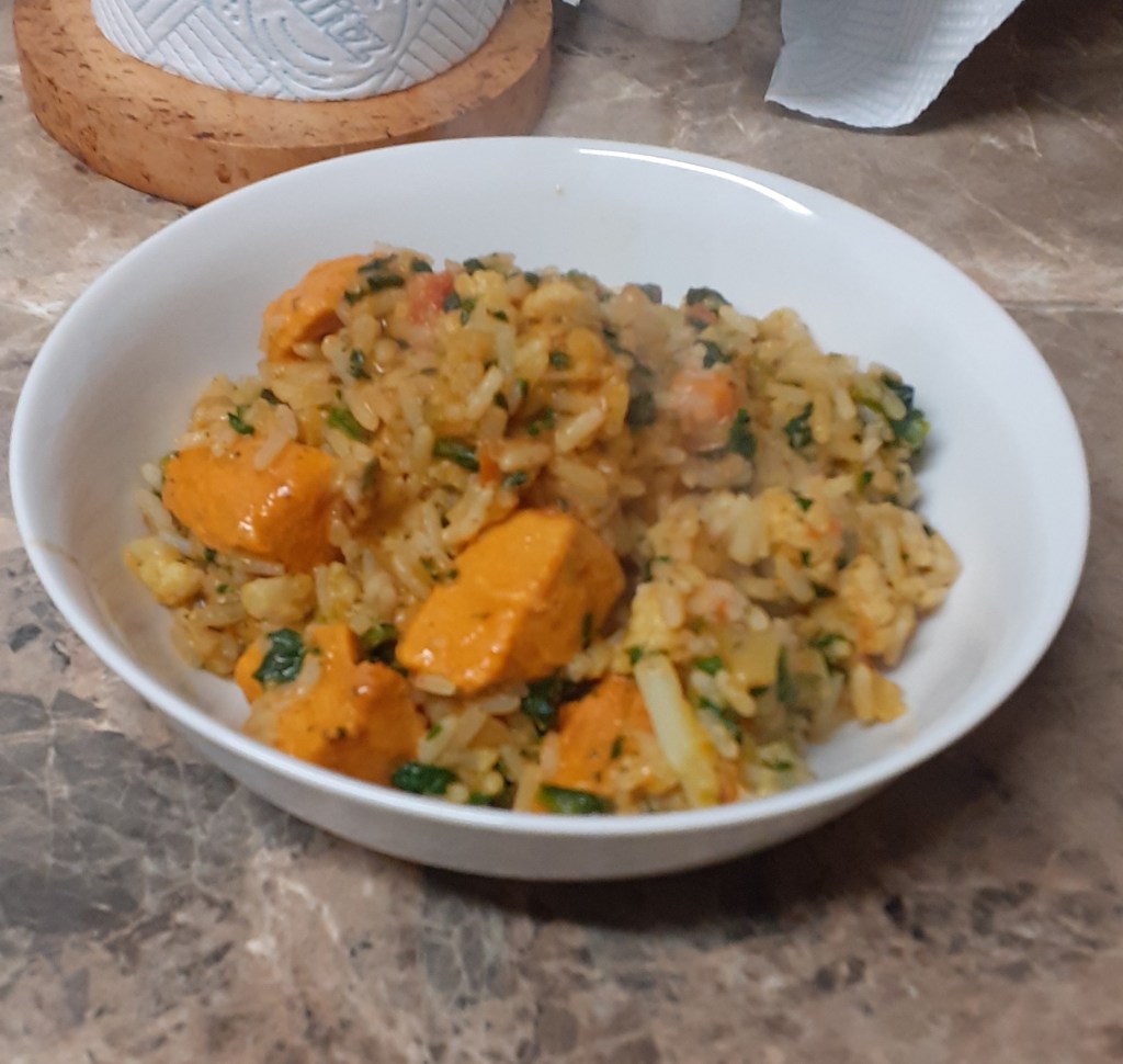 The biryani smelled suitably curryish when the bag was opened and, once I’d managed to get the big lump of frozen rice out through the opening, looked… well, you can see that for yourself. It only took about ten minutes to turn the frozen lump into bubbling hot dinner, although at the cost of a slightly scorched pan. (Thank you so much to carer S for scrubbing it back to a usable state.)
