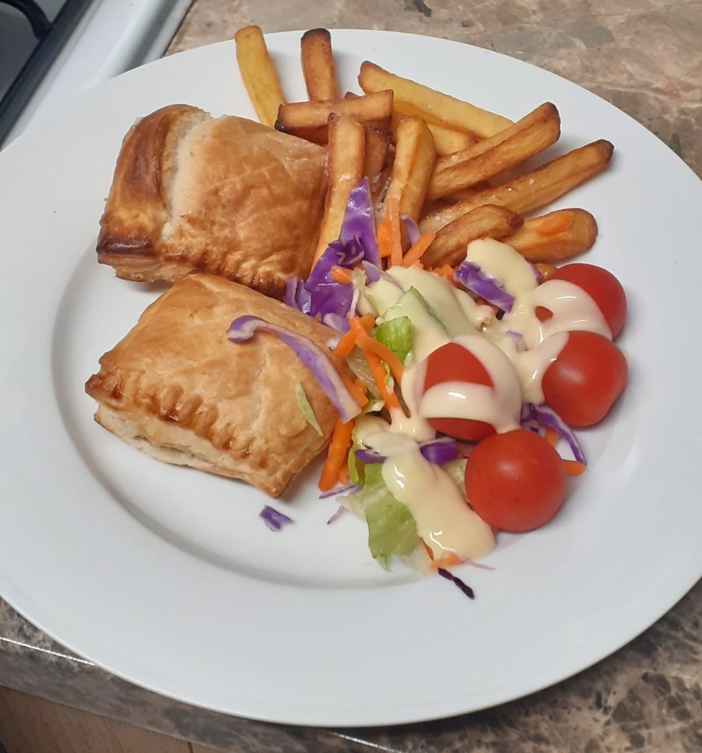 Chicken and bacon pasties, chips and salad