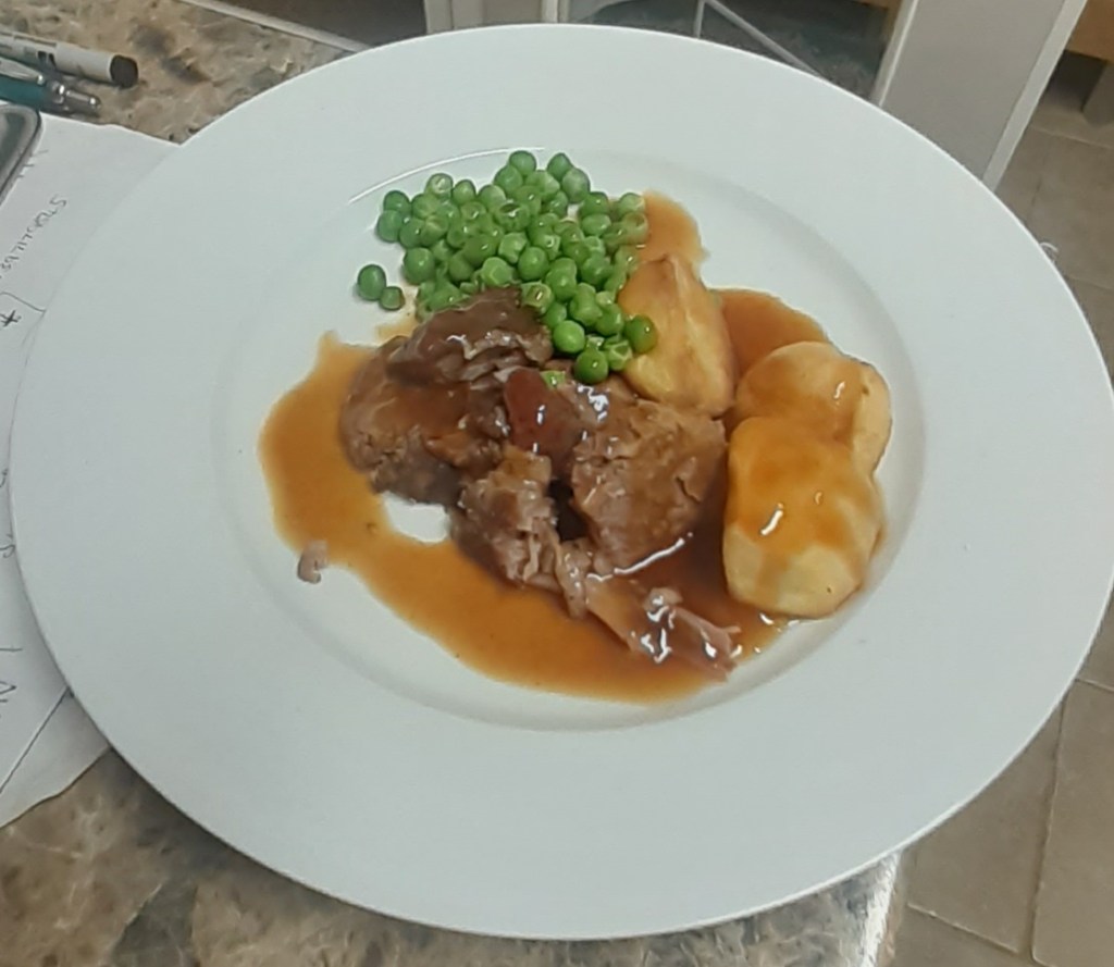 Today was the very fancy-sounding meal in the post title, which actually came in a cardboard box from Tesco. It was really very good, once saved from a floor-y fate: very tender, not fatty at all, and with a lovely scent of the billed garlic and rosemary. The jus (we all know it’s gravy and you’re just trying to make it sound posh) was verging on excellent, with a herby flavour and a slight sourness that cut through the richness of the meat. I haven’t done ratings in a while, but this was a solid 8/10 in my opinion.