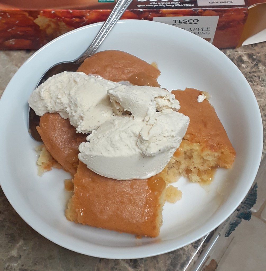 Then toffee apple pudding, another Tesco thing from a box, and an even better one imo: two minutes in the microwave produced a fluffy, flavourful sponge covering recognisable chunks of apple that retained their tartness despite being covered in toffee sauce. The vanilla ice cream might not be mum’s beloved coffee variety (although you wonderful Pineapples have given me several possible ways to address that), but she had to agree it’s good ice cream: rich and creamy, not too cloyingly sweet, and with a distinct but not overpowering vanilla flavour.