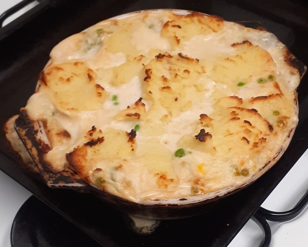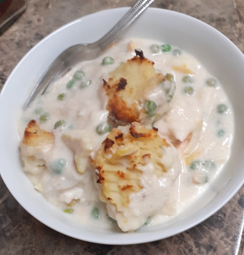 Tonight’s fish pie was homemade-ish, in that I put it together out of fish pie mix (salmon, haddock, smoked haddock), cheese sauce concentrate from a jar (just mix with milk, in a small enough quantity I fail to see why this product exists (I bought it thinking the jar contained enough for multiple meals: it doesn’t, and I will definitely just make my own in future)), frozen peas, and ready-made mash (which seems even lazier but for me is totally worth it to save the effort of cooking and mashing potatoes).