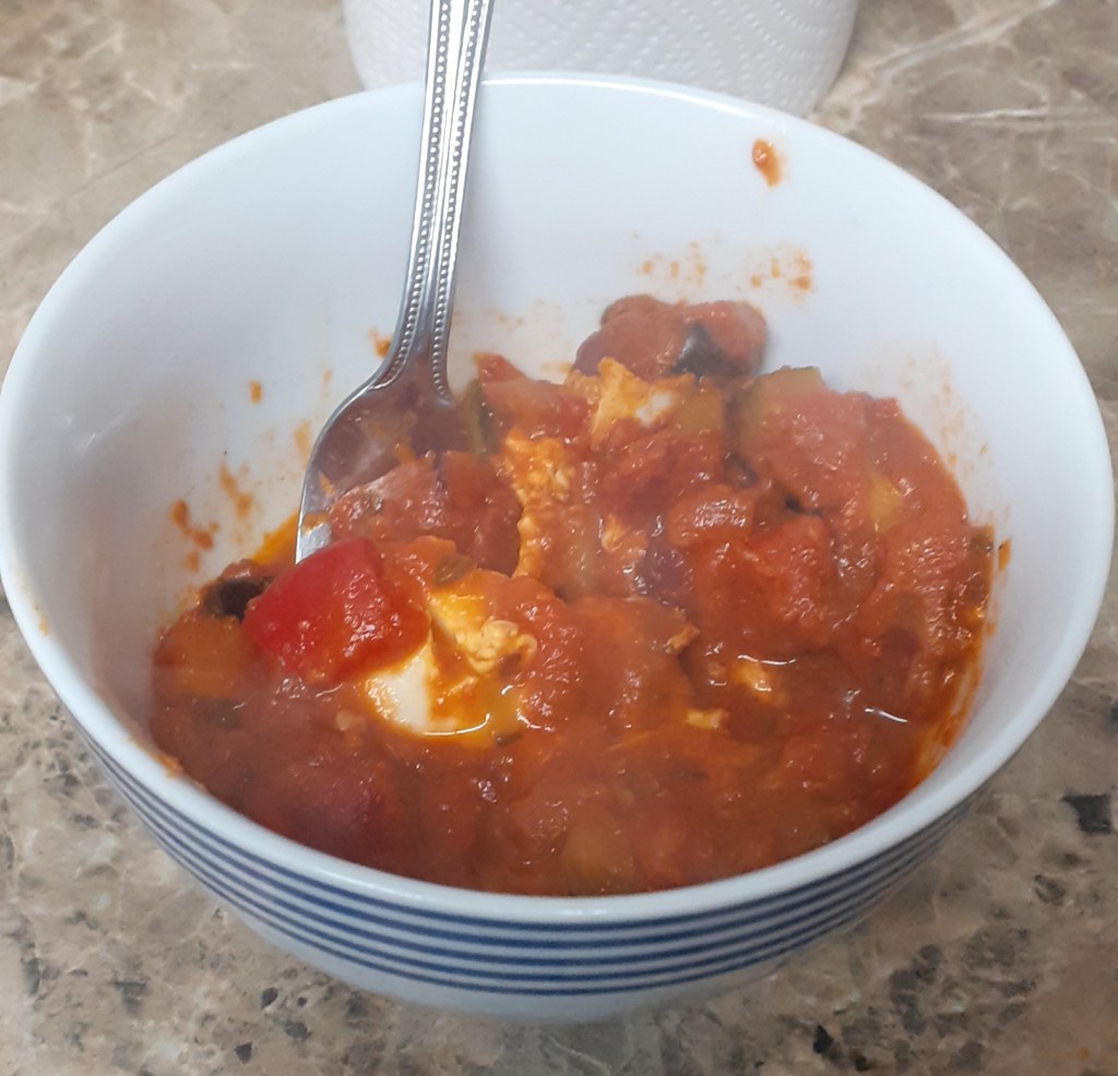 So: baked eggs, which is a lazy, unspiced version of shakshuka. It’s just the last of the frozen Mediterranean veg cooked in a frying pan with two-thirds of a jar of tomato pasta sauce, then eggs cracked in to cook in the sauce. Mum took all the naan bread, despite me saying it was to share, but kindly gave me a piece to mop up my sauce when I asked.
