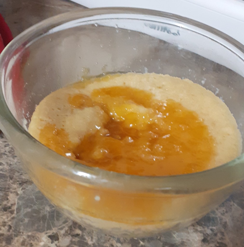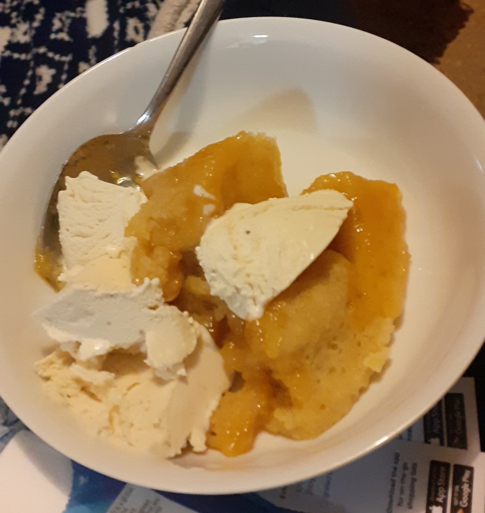 Then a homemade almond and apricot pudding, which was made using a microwave sponge recipe from the internet but with just over half the flour subbed with ground almonds, and a generous amount of apricot jam which started off at the bottom of the bowl but, as you can see, ended up partially on top.