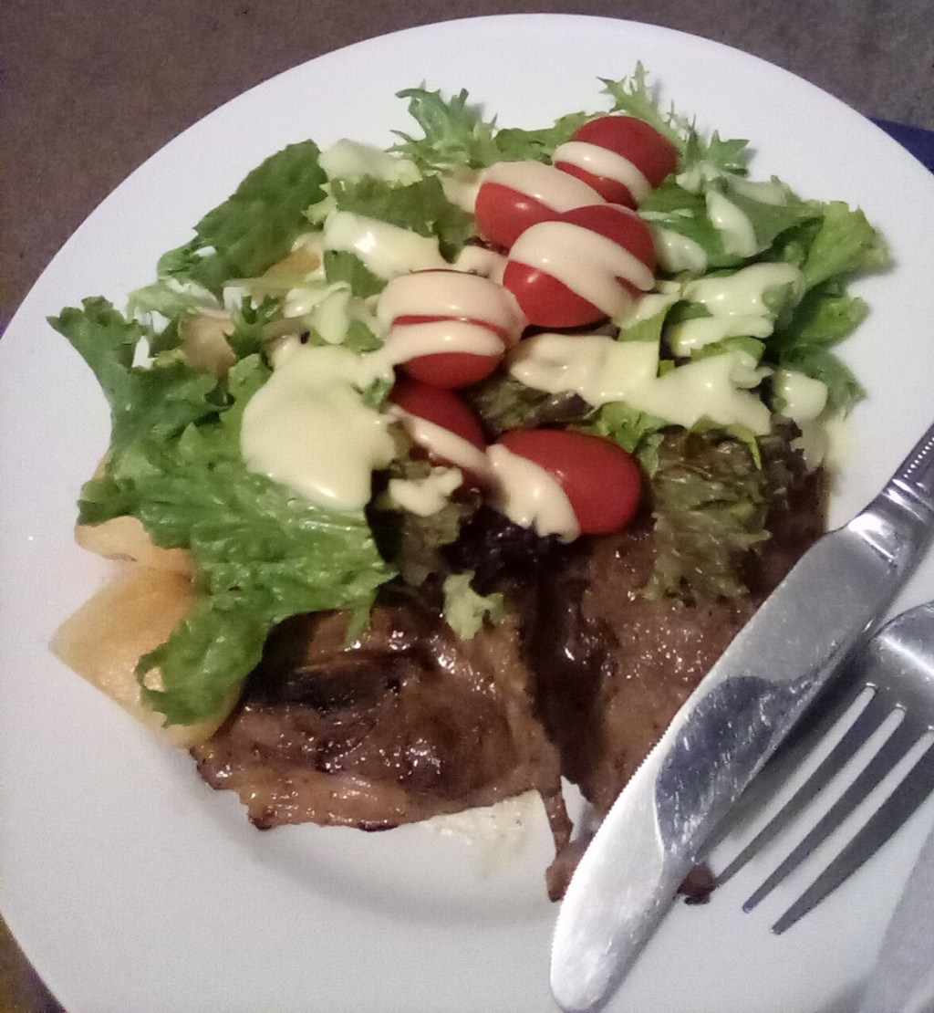 The roasties were the last of the ones from the bag I bought for Christmas dinner (McCain Triple Cooked Roast Potatoes which, after a number of tries, I would now strongly recommend), and the salad was a Mild Mix of Florette brand, which was good as long as I picked around the radicchio. Why do so many companies put that stuff in their salads? It may sound fancy but it tastes nasty: please stop it.