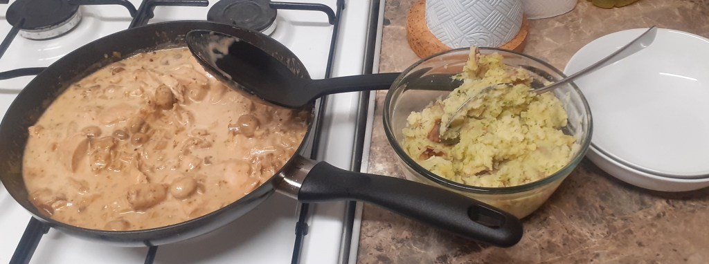 Chicken removed and chopped into small pieces (OK, torn rather than chopped, as mum’s knives are mostly too blunt to cut anything – I need to spend some time with them and a knife sharpener), frozen chopped onion went into the pan. Ready-chopped veg is one of the shortcuts I mentioned: it feels silly paying for something like this rather than just buying a bag of onions, but the effort saved is worth it to me atm. (Cooking with a chronic illness is a constant balancing of effort saved with quality reduced, I’m finding. Ready-chopped veg is on the right side of that scale for me; ready-cooked jacket potatoes are not, although they did finally find a good home as the mash for this dish – just defrost in the microwave, squash them, add butter and the potato seasoning, then reheat when needed.)