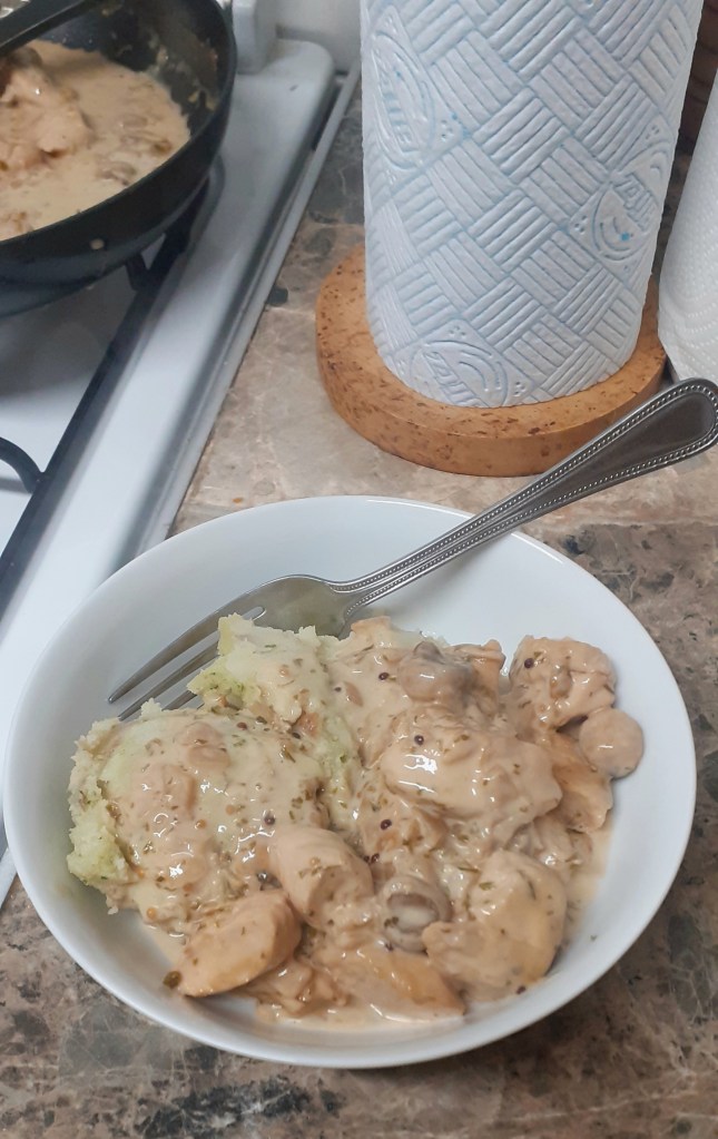 Seated on my perching stool, I started to cook: first a pack of exceedingly tiny button mushrooms, which mostly didn’t need chopping but did need cleaning, which involved damp kitchen paper and far too many bits of mushroom slipping through my semi-numb fingertips and ending up on the floor. That done, the chicken went into a pan, where it stayed until I got fed up with watching it, as the burner which is easiest to reach from my stool is the smallest one, which doesn’t generate enough heat to fry things satisfactorily.2
