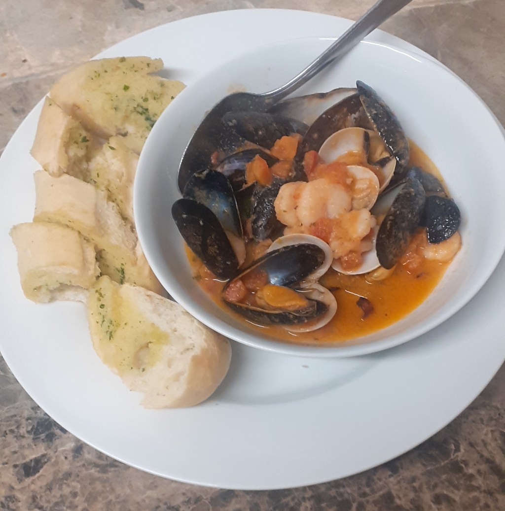 Frutti di mare with garlic bread; chocolate melt-in-the-middle pudding with cookie dough ice cream
