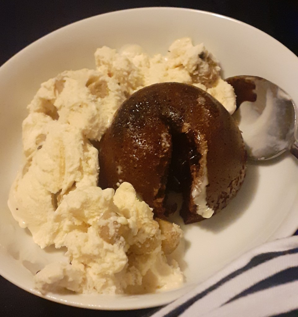After a day like today I thought I deserved something sweet so microwaved a chocolate pudding (Aunty’s brand, bought from Tesco, good flavour but not as melty in the middle as promised or desired) with the last of the cookie dough ice cream (very good, would (and definitely will) eat again).