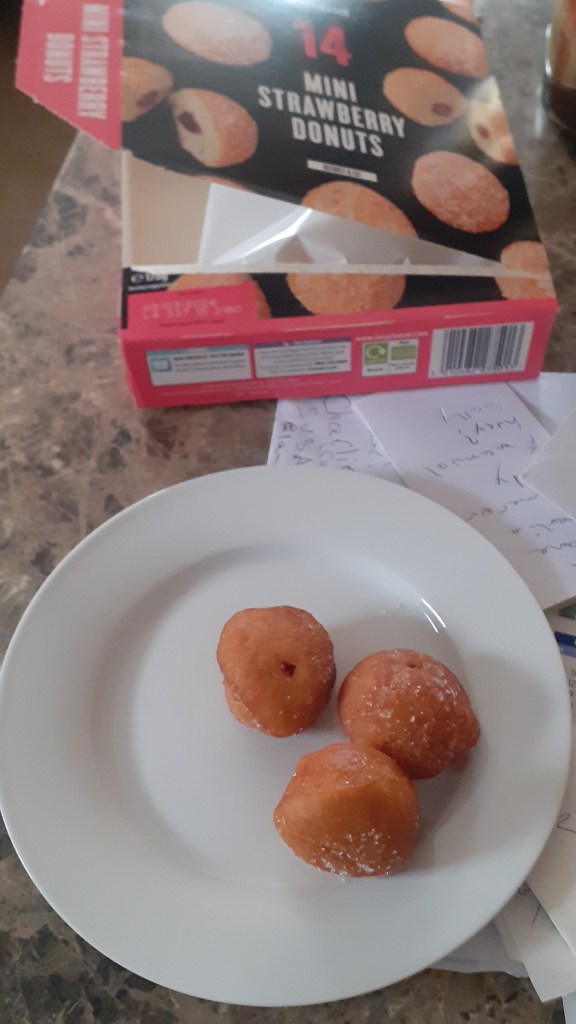 Then, for the required hit of post-dinner sugar, mini jam doughnuts from Iceland, which you just take out of the freezer and leave to defrost. Mum liked them more than I did, but they are doughnutty enough to pass muster, if a bit too tough to be as good as the real thing. At the price (about £2 – £3 a box, but acquired under a buy two get one free deal so functionally less than that), and for something you can just keep in the freezer until needed, I would hesitantly recommend them – maybe a 6.5 / 10 on my semi-abandoned rating scale.