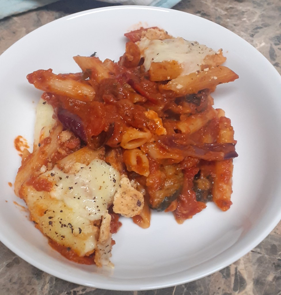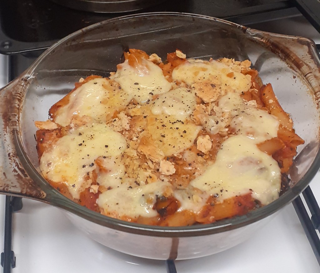 And so, with my usual smooth segway, to tonight’s dinner, which was the veg pasta bake that is a particular favourite of mum’s: roasted Mediterranean veg (from a bag from the freezer these days), pasta sauce (from a jar), and cooked pasta, topped with mature cheddar and a rosemary cracker crumb (a few crackers left over from the ones I bought to go with cheese over Christmas, now too stale to eat but still crunchy enough to crumble over the pasta2).