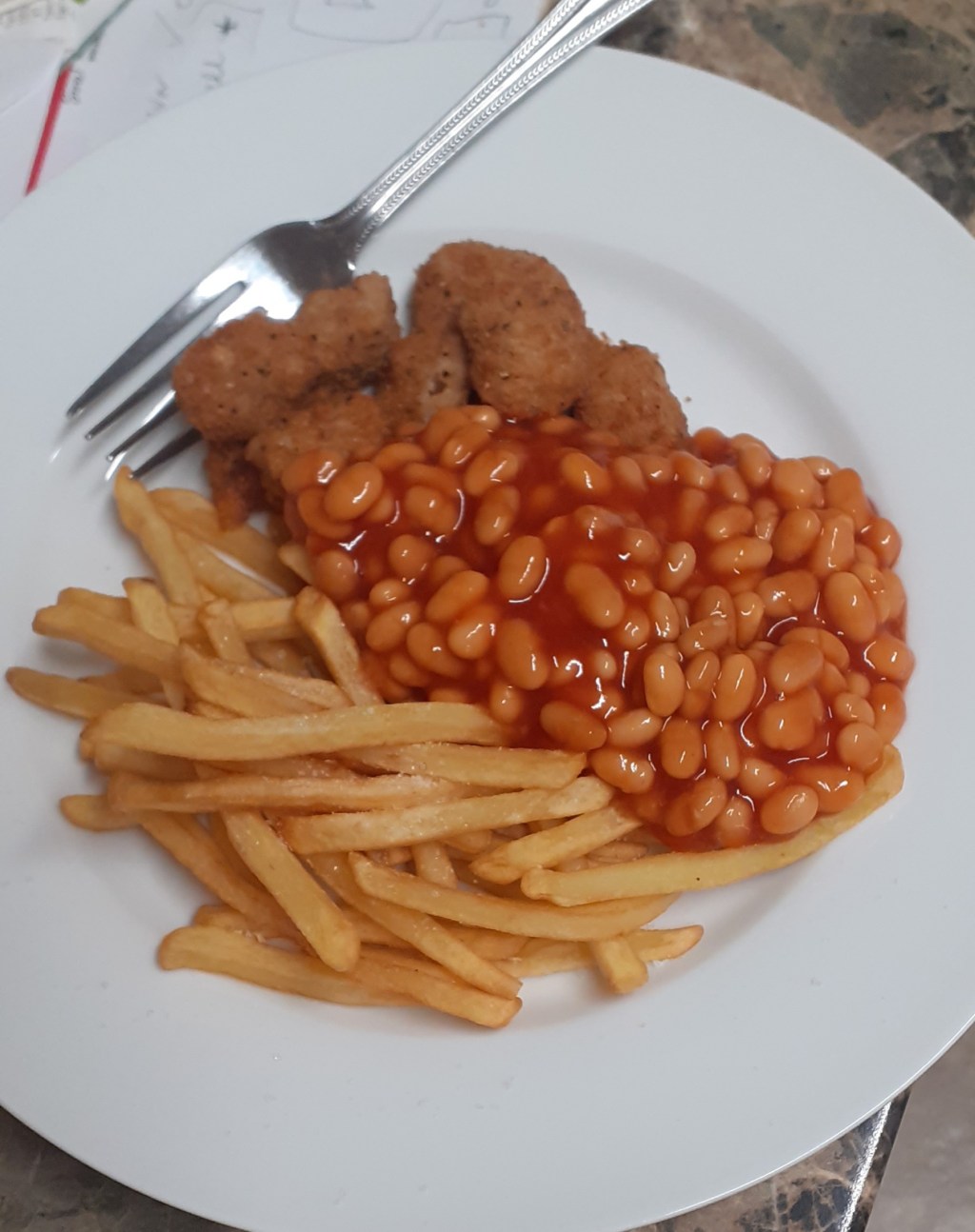 Dinner tonight was what I have long called a “beige meal”, comprising beige breaded shrimp, beige chips (or fries), and beige (well, orange) baked beans. The southern fried shrimp were another Iceland product, with nuggets of chopped prawns covered in surprisingly peppery hot breading. Mum said they were too spicy, but ate her portion so they can’t have been that bad.