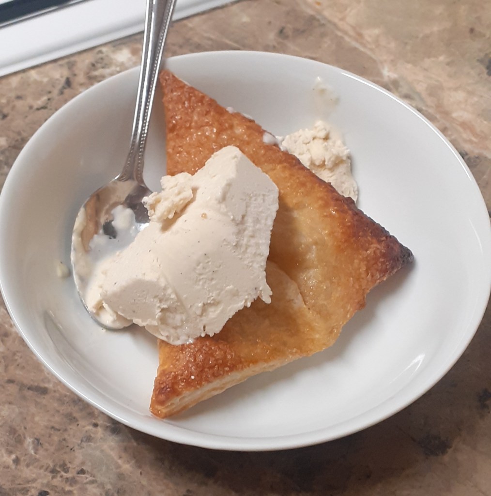 I had promised mum a hot pudding after dinner but was surprised when her response to my question of what pudding she wanted was “apple turnovers”, as I had completely forgotten about them in the week or so since I bought them (I swear this memory loss thing is catching sometimes). Luckily they were, like most Iceland products, cookable from frozen, and the result, after twenty minutes in the oven, was crispy pastry with limited but tasty amounts of chunks of cooked apple and vanilla-y custard. I had mine with what was left of the vanilla ice cream, while mum went for the “loaded caramel” one (caramel ice cream, caramel sauce, chocolate rounds with caramel filling) which I had bought for myself, thinking it would be far too sweet for mum, only for her to dive in with enthusiasm. As I bought it with mum’s money, I didn’t feel I had much scope for complaint!