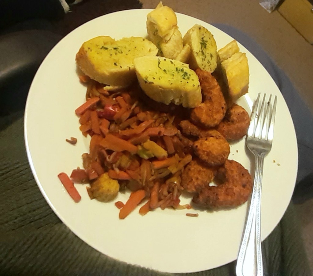 Sweet and hot prawns, stirfry veg, garlic bread; mince pies with cream