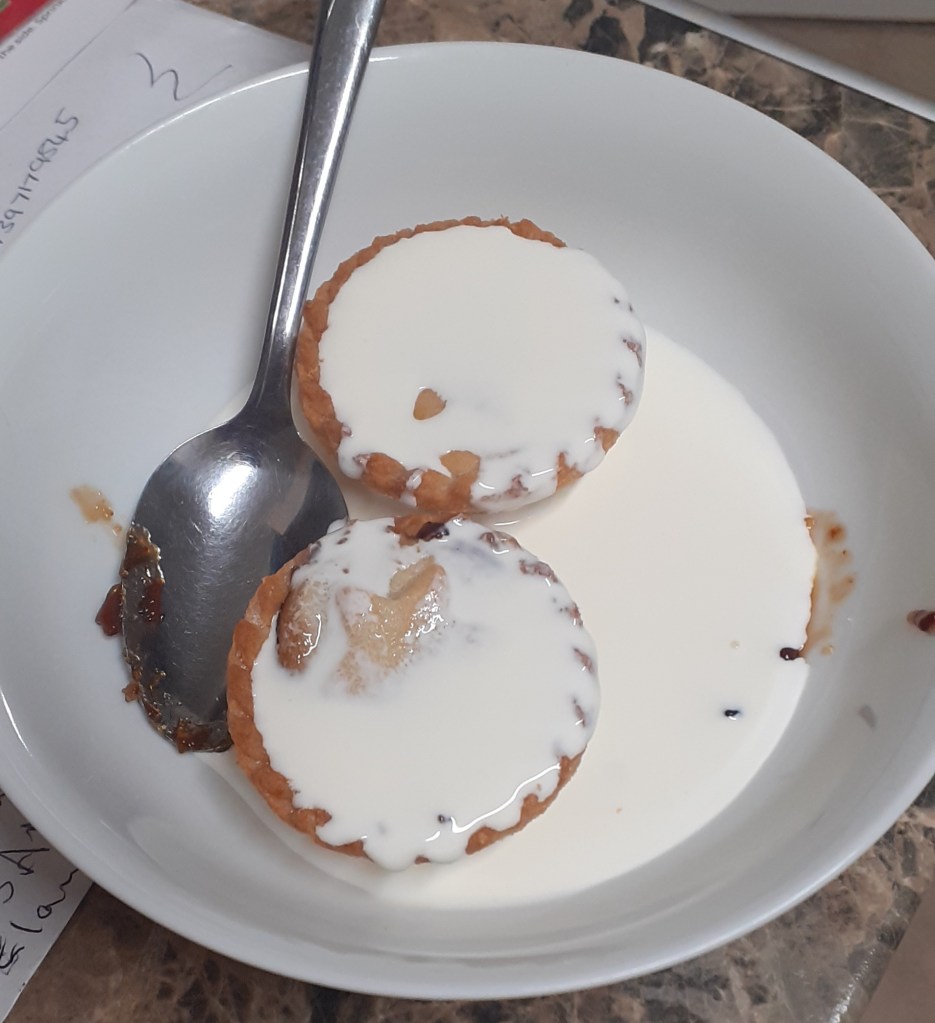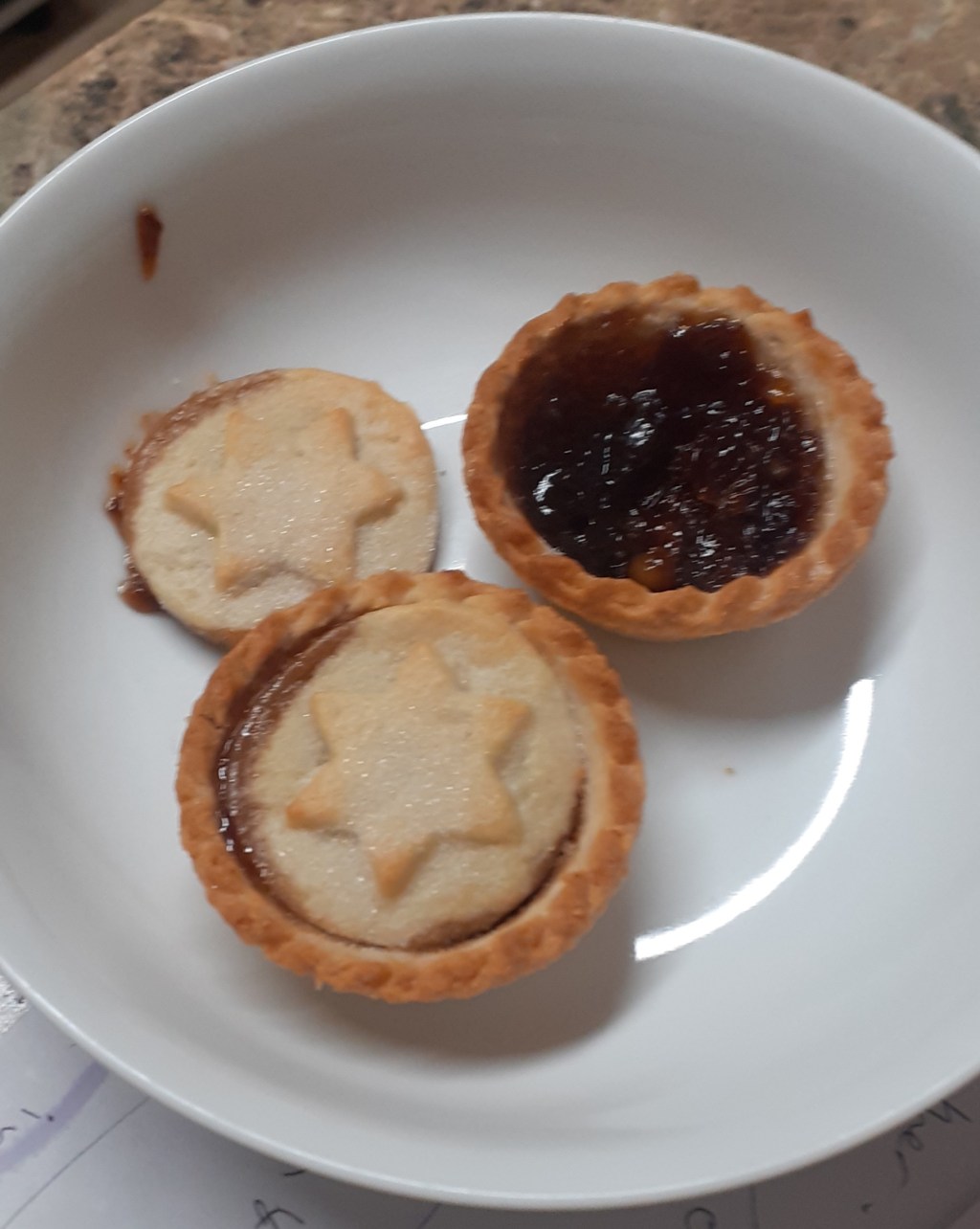 I decided on mince pies (not many left now 😥), but rather over-estimated how long they would take to heat in the microwave. After about 20 seconds, there was a distinct “pop”, and I opened the microwave door to find the pressure of the hot mincemeat had blown the lid of one of the pies off its base, spraying hot spiced sugar across the inside of the microwave which mum cleaned only a few days ago. Oops.