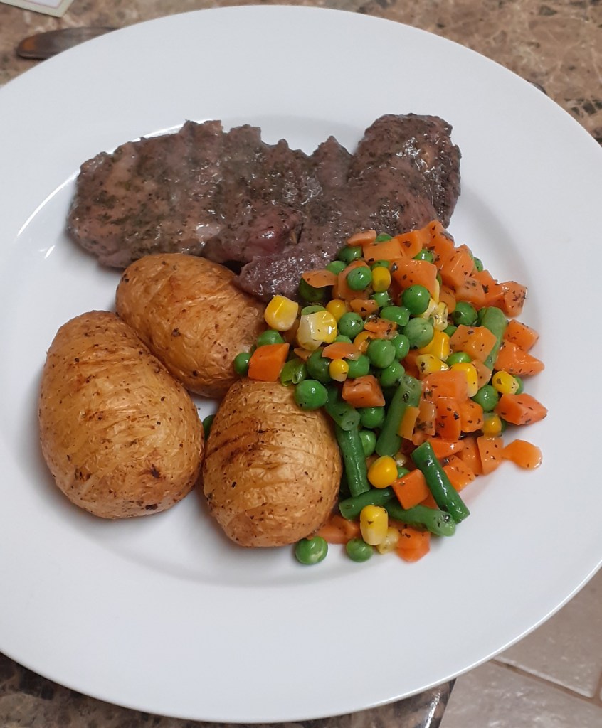 For dinner we had minted lamb, from Sainsbury’s, and much better than the Iceland equivalent we had the other week as these were all meat and no bone, and good tender meat at that, even being very slightly overcooked (my mistake – I lost track of time and left them a minute or two too long, which is more than enough to be a problem when the meat is this thin). To go with it were the last of the hasselback potatoes (still tasteless and with chewy, rather than crispy, skins – I won’t be buying them again) and mixed veg with mint butter (which sounds fancy but was just a spoonful of butter and a bit of mint sauce stirred into the microwaved frozen veg).