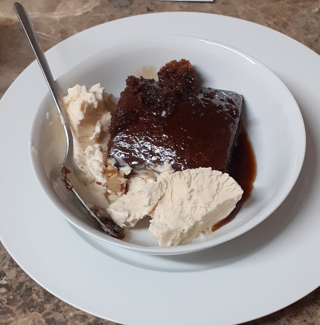 Minted lamb with potatoes and mixed veg with mint butter; coffee sponge pudding with ice cream
