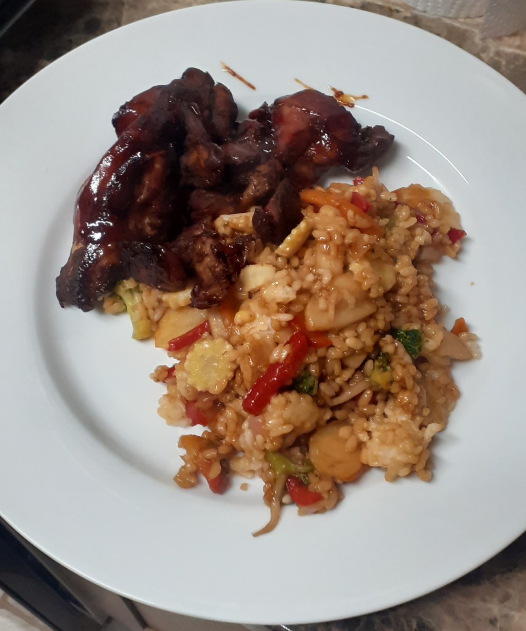 To accompany the chicken I did sticky rice, from a microwaveable packet that was so solid the instruction to “squeeze to separate the rice” can only have been meant as a joke. Instead I heated it in a pan with some frozen veg until it softened enough to be something other than an emergency building material, then stirred through the leftover teriyaki sauce. It wasn’t fancy, but it was nice, and mum gave it her seal of approval by eating it.