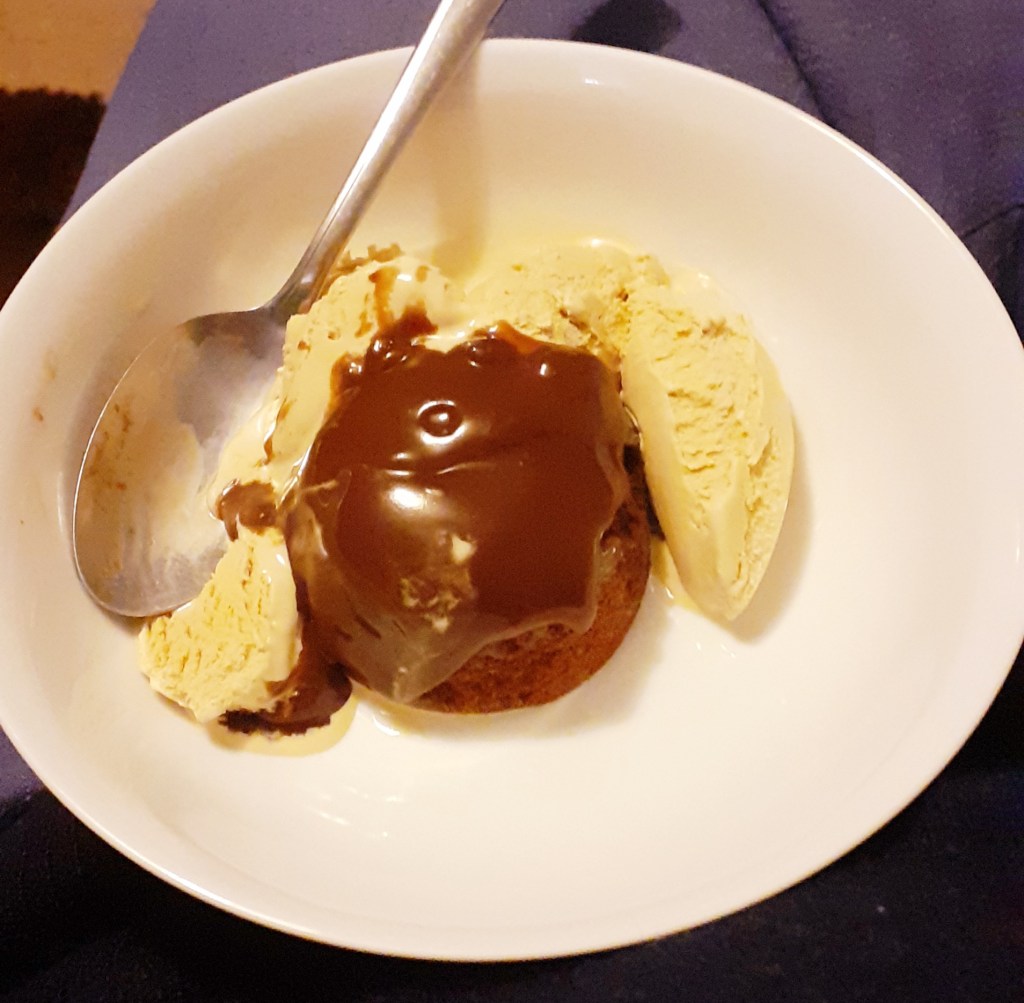 To follow I microwaved a couple of Cadbury’s sticky chocolate puddings, which were nice enough but served mostly to convince me that I really want to try making my own very soon; mum had hers with cream, while I tried the blonde chocolate ice cream I got for £1 on the latest grocery order. I haven’t tried blonde chocolate (caramelised white chocolate) before so don’t know how accurate this was in terms of flavour, but I quite like it and it’s sweet enough to knock even my sweet tooth into temporary submission.