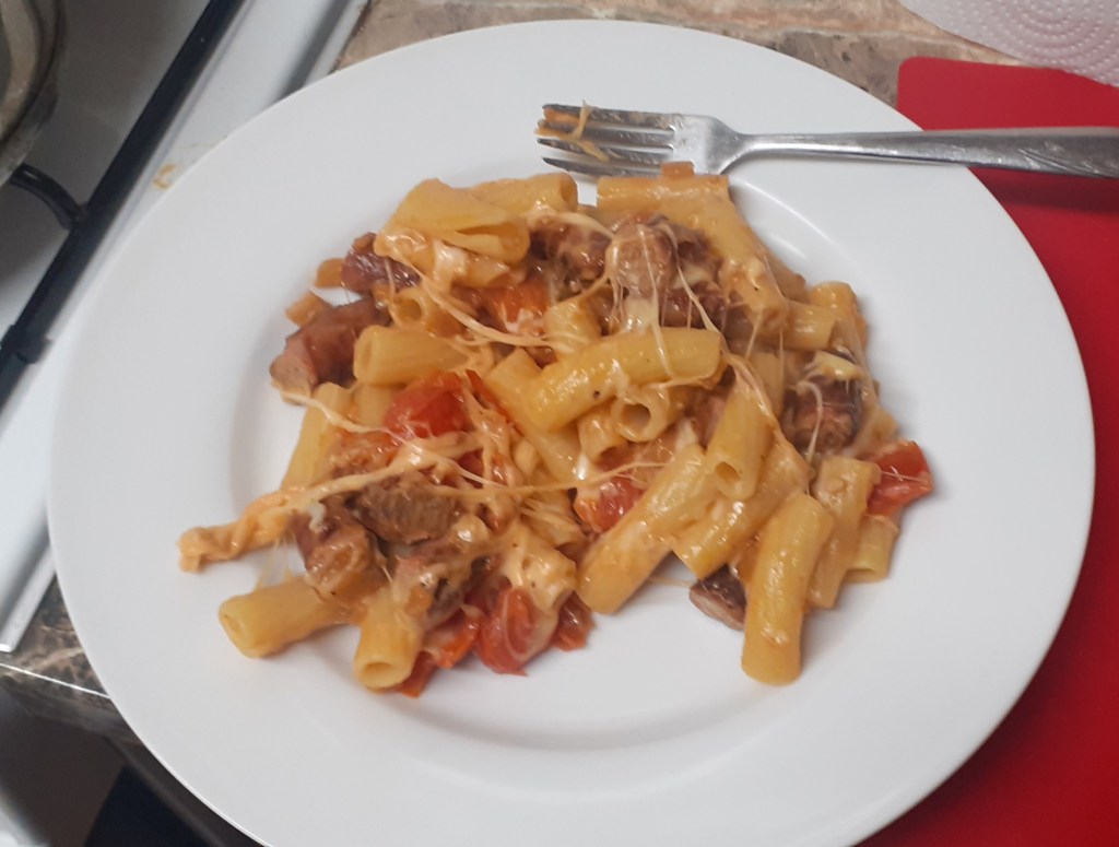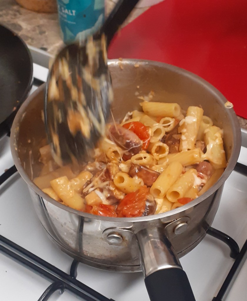 What I ended up making was pasta with a sauce of chopped up chipolatas, the last of the cherry tomatoes which were starting to wrinkle1, some chopped frozen onion, and a generous tsp of chopped garlic. When the pasta was cooked I added it and a bit of its cooking water to the sauce, then stirred through the last of a bag of grated mozzarella and a generous grinding of black pepper.